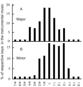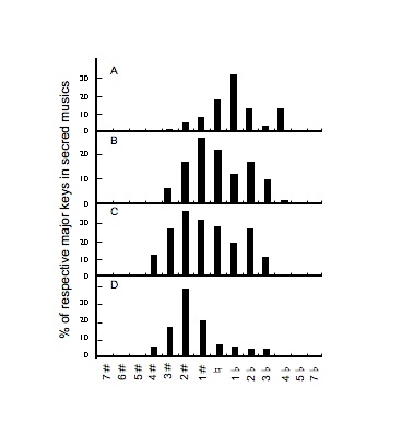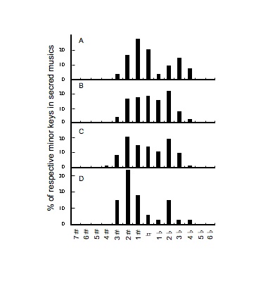 実際に、現存するバッハの器楽曲で、各調性の相対使用頻度をみると、演奏しやすい中央の♮調(ハ長調、イ短調)付近にピークがあり、♯圏と♭圏の左右でほぼ対照的に減少していく(Fig. 3A、B)。詳しく見ると、長調(Fig. 3A)では特にこの傾向が顕著で、ハ長調、ト長調を中心に、左右対称の正規分布に近い。短調(Fig. 3B)でも、分布のピークは、イ短調(♮)にあり、ハ短調(3♭)にかけての♭圏が多用されているが、それでも中央付近にピークが有って、両端で少なくなるという分布をしめす。小林が言うように、バッハが特定の調性に拘泥したという形跡はない。あえて言えば3♭のハ短調であろうか。しかし、それもピークのイ短調とはほとんど差がない。器楽曲については、諸楽器で演奏が容易な♮調を中心に作曲されたと結論してもほぼ間違いないだろう。いずれにしても、#圏に、ましてやロ短調にバッハのこだわりあるようにはとても思えない。しかし、両受難曲での調性選択との関係で参考にするのなら、問題は宗教曲である。