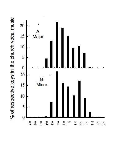 以上の結果を踏まえたうえで、《ヨハネ受難曲》の調性をもう一度見なおすと、その分布は器楽曲と同様に、短調の調性分布は♭圏寄りにピークがあり(Fig.1BとFig.3B)、長調は《ヨハネ受難曲》では遠隔的双極性ピークではあるが、♯圏と♭圏の間で調性分布が左右均衡しているという点ではやはり器楽曲の特徴を示している(Fig.1AとFig.3A)。言い換えれば、調性使用頻度に関する限り《ヨハネ受難曲》は器楽曲的に作曲されたといえる。
