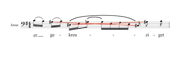MP2:5-8は、《マタイ受難曲》に出てくるイエスの最初の言葉(マタイ伝26:2)であり、いやでも《マタイ受難曲》全体のモチーフを象徴するパッセージである。「過越しの日に自分は十字架にかけられるために引き渡される」と予言することで、イエスが死を予期していることが語られる。ここで、いきなり有名な十字架音型が現れ(注2)、ロ短調で歌われるイエスの言葉とあいまって、まさに《マタイ受難曲》のモチーフが提示される。