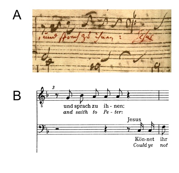 Fig.14. バッハが、教会の権威を象徴する筆頭弟子ペテロの優位性を否定し、教会批判をしたと思われる重大な聖句の変更箇所。A. バッハがマタイ伝26:40にある「zu Petro」をMP24:3で「zu ihnen」と書き換えた部分(バッハ自筆譜のファクシミリ版より)。B.当該部分のAlfred Dürr監修によるマタイ受難曲(BWV244)総譜(Bärenreiter 5038a, Klavierauszug Vocal Score)。詳しくは9章 4節18項参照。