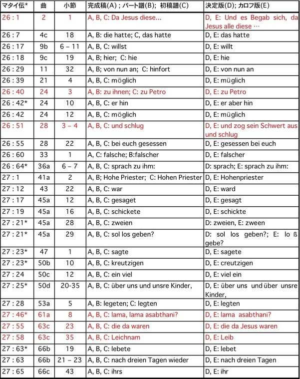 マタイ伝の章:節番号に*があるものは、デュルの報告ではリストされていない(パート譜は未確認)。ハース版、ニュルンベルグ版聖書にバッハテキストと同じものがあった可能性はあるが、少なくともいくつかはおそらく見落としである。例えばMP24:3、MP61a:8は確実に見落とされていると思われる。本表ではルター訳決定版とカロフ版のいずれかと相違があるものをリストした。ただし、カロフ版に見られる明らかに誤植と思われる箇所は除く(例えば9章5節23項、28項参照)。赤字で示したものは、筆者が特に重要と考えるルター訳聖書からの変更である。それぞれの解釈については9章対訳批判論を参照。A, B, C, D and E represent the Bach’s autographic score (1736), part score, first score according to Altnickol (1727/1729), Luther’s Bible (1545) and Calov Bible after Luther’s translation (1681-1682), respectively.