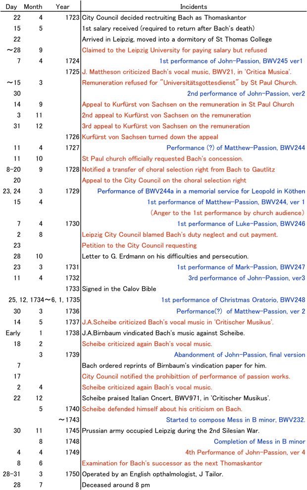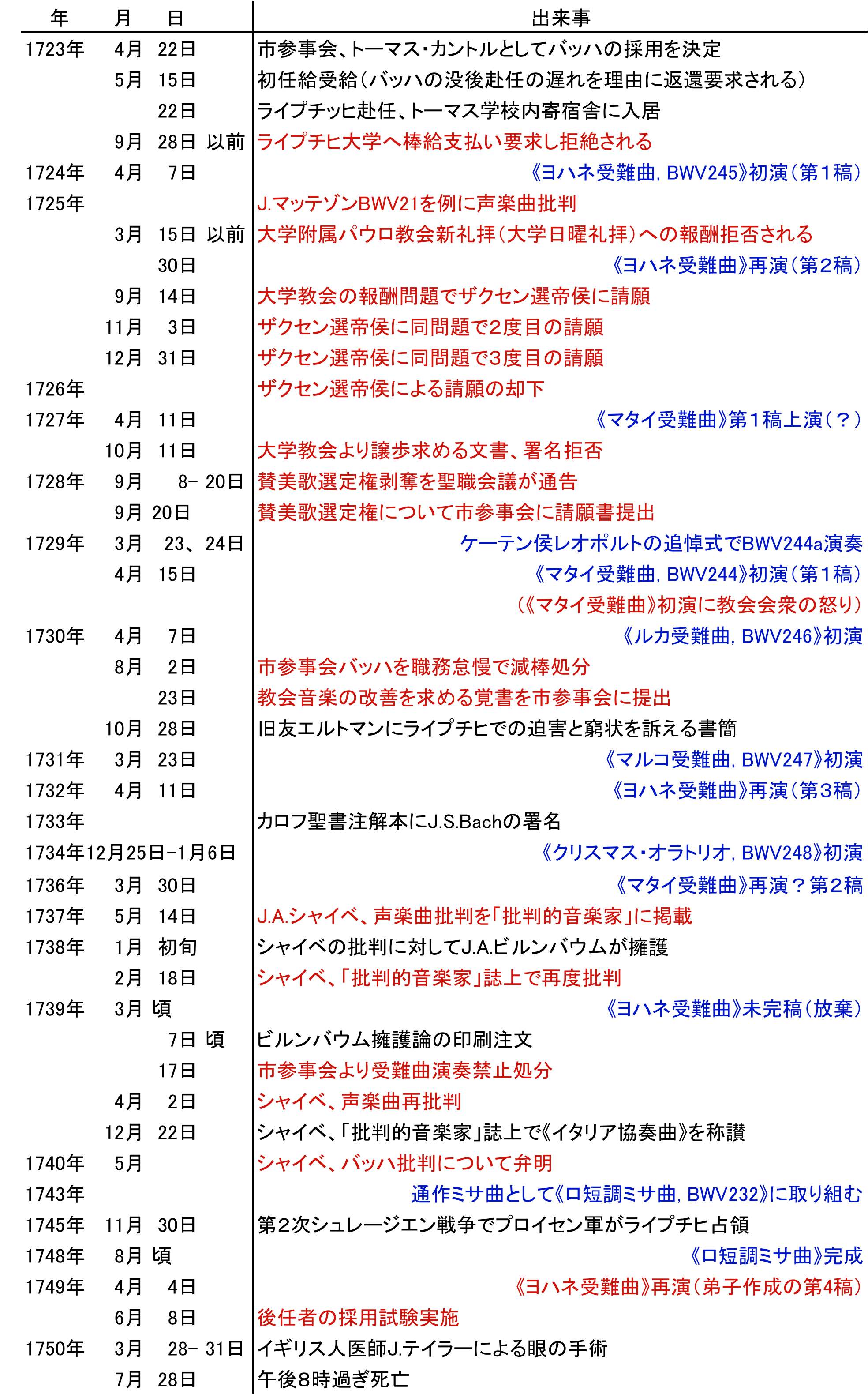 右詰めは作曲、演奏関係の、左詰めはそれ以外の事件、事象を示す。「嫌悪、嫉妬、迫害」に関連するものは赤字で、バッハによる演奏、作曲活動は青字で、両者が重なる場合は赤字を優先した(1749年の《ヨハネ受難曲》第4稿の演奏は、バッハへのハラスメントである可能性が高い)。それ以外は黒字でしめした。受難曲演奏年代について筆者が懐疑的なものは ? を付した。資料は「バッハ頌」(角倉/渡辺編)白水社、「バッハ事典」(角倉一朗監修)音楽之友社、「バッハ事典」(磯山/小林/鳴海編著)東京書籍による。