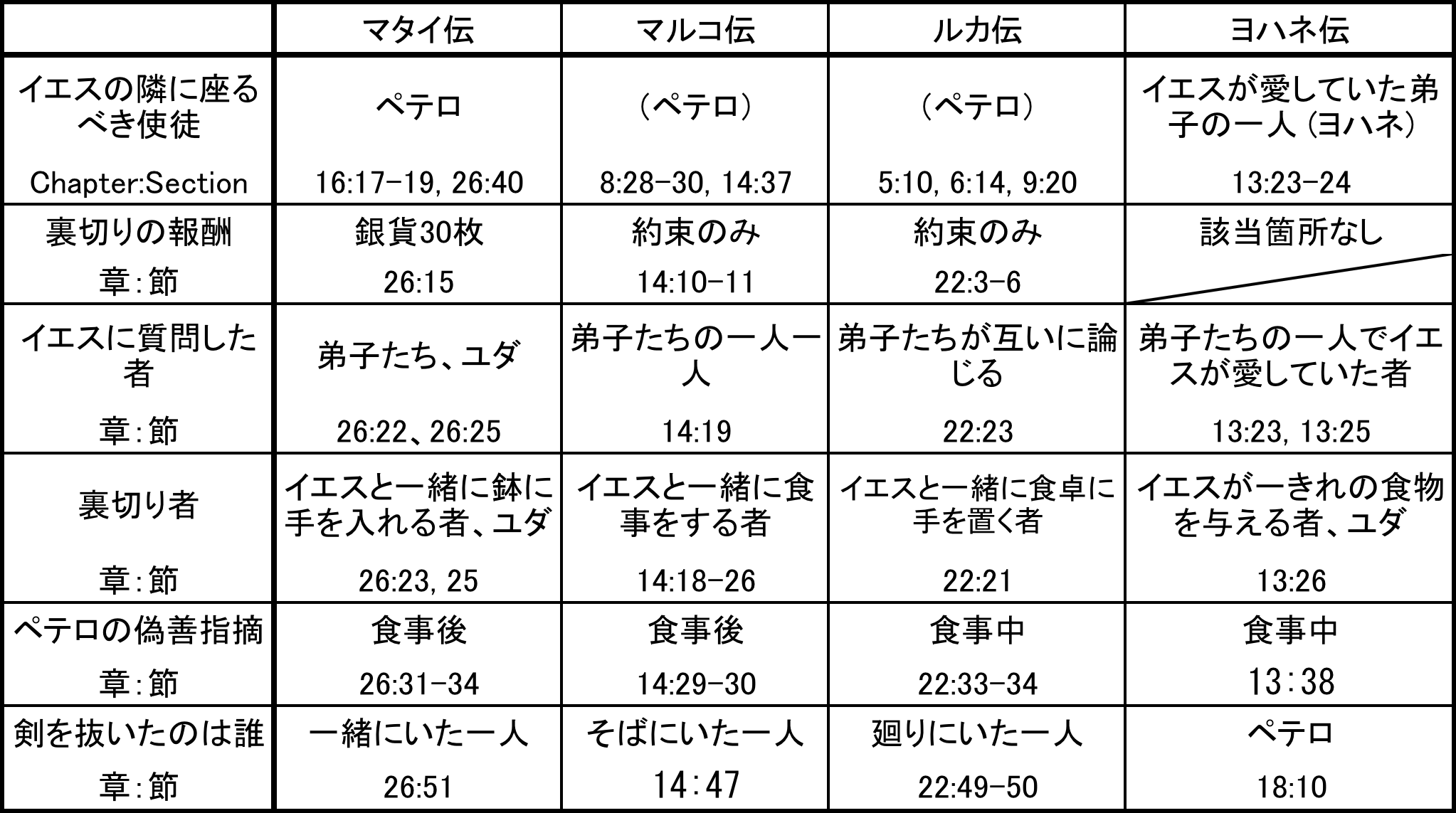 ヨハネ伝:意外なことに、ヨハネ伝には12使徒全員の名前と序列を示す記述がない。それらしい記述は、イエスに会った順として書かれている部分である(1:40-44)。そこでは、「アンデレ、シモン(ペテロ)、ピリポ」までが書かれている。しかも、最初にイエスに出会ったのはペテロではなく、ペテロの弟アンデレである。多くの弟子が去ったのち(7:66)、残った12人の弟子たちに、イエスが、「あなたがたも、去ろうとするのか(7:67)」と尋ねたとき、ペテロが「わたしたちは、あなたが神の聖者であることを信じ、また知っています(7:69)」と答えたが、イエスはそれに答えず「あなたがたのうちのひとりは悪魔である(7:70)」と、ここでは名をあげることなくユダの裏切りを予告する。ここで、ペテロの言葉がまったく無視されたのは、イエスがペテロを後継者指名したマタイ伝とはもちろん、ペテロを戒めたマルコ伝、ルカ伝とも違う。そのほかに、共観福音書と大きく違うのは、ユダが事前に祭司長らのところに出かけて裏切りを約束する場面がまったくないことである。ユダの裏切りはイエスも了解していたかのごとくに扱われている。それは、イエスの臨終の言葉(口語訳「すべてが終わった」だが、ラテン語訳「consummatum est」、ルター訳「Es ist volnbracht」は「ことは成就した」)とも矛盾しない。最後の晩餐は過越祭の日ではなく、その前日(13:1)の夕食である。ユダの裏切りを知っていたイエスは夕食の前に弟子たちの足を洗い、その意味は後にわかるとだけ告げる(13:4-15)。これらのことからは、ヨハネ伝の著者は、他の3つの福音書を参考にしてはいないと推量されていることが納得できる。食事の中で、イエスは弟子たちのひとりが裏切るともう一度予言したが、弟子たちは誰の事かわからず、互いに顔を見合わせた(13:21-22)。弟子たちのひとりで、イエスの愛していた者が、イエスの胸に近く座っていて(13:23)、ペテロが彼にイエスが誰の事を言ったのか聞いて、知らせてくれと頼む(13:24)。その弟子はイエスの胸によりかかって、誰の事かと問う(13:25)。イエスは「わたしが一きれの食物をひたして与える者が、それである」と言ったのち、イスカリオテのユダに与え(13:26)、「しようとしていることを、今すぐするがよい」と言う(13:26)。しかし、イエスが言った言葉の意味は誰にもわからず(13:28)、人々は、ユダが(教団の)金入れをあずかっていたので、イエスが彼に「祭のために必要なものを買え」と言ったか、あるいは貧しい者に何か施しさせようとしたのだと理解した(13:29)。ユダが去ったあと、弟子たちはイエスの長い説教を聞く。最後に、ペテロが「あなたのためには命も捨てる」(13:37)というのを、鶏が鳴く前に自分を三度否定すると予言し、ペテロの偽善を指摘する(13:38)。食事が終わった後、オリブ山に出かける場面はない。したがって、イエスが恐怖に苦悶するゲッセマネの祈りも、その時に呑気に寝ていた弟子たちを叱責する場面もない。捕縛の場面では、「シモン・ペテロは剣を持っていたが、それを抜いて、大祭司の僕(しもべ)に切りかかり、(18:10)」とある。ここで他の福音書では出て来ない勇者の名が突然「ペテロ」であることが明らかになる。その前にペテロへの無視、偽善の指摘が続いたあとだけに、やや唐突な印象を受ける。それを見たイエスは、「剣をさやに納めなさい。父がわたしに下さった杯は、飲むべきではないか」と言い、ここでもペテロが自分を理解していないことをとがめる。ヨハネ伝の最後には、甦ったイエスがペテロの誠意を疑うように「あなたは、わたしを愛するか」とペテロに何度も問うので、彼も悲しくなったとある(21:17)。ヨハネ伝21;20には「最後の晩餐」でイエスの胸近くに身を寄せていた愛弟子がヨハネであったことが明かされ、ペテロが嫉妬する様子も書かれている(21:21)。