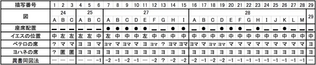 描写番号と座席配置は表14と同様である。「イエスの位置」はそれぞれの描写の中でイエスが描かれた位置を示す。イエスは画面の左(左)または中央(中)に座る。「ペテロの席」はペテロの位置がヨハネ伝(ヨ)、マタイ伝(マ)、又は両方(ヨマ)のいずれに基づいているかを示す。「ヨハネの席」は、同様にヨハネの位置を示す。ヨハネについては、中世初期の二つの例外(描写番号2, 3)を除いて常にヨハネ伝(ヨ)に基づいている(描写番号4〜28)。描写番号2と3では、ヨハネは匿名化されている。異書同図法-1、-2(第一、または第二異書同図法)については、本文参照(XI-3-(II)LdV(vi-vii))。