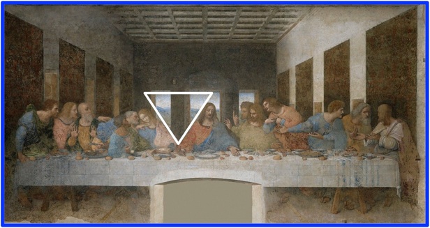 たとえ聖書の知識がなくても、《最後の晩餐》にはヨハネとイエスの間に不自然な空隙があることに気づく(Fig. 34)。二人の間には逆三角形が浮かび上がる。 このような空隙はそれまでの描写に例がない。イエスとヨハネの距離が強調され、ヨハネ伝に基づく図法としては異様である。