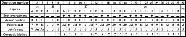 Depiction number and Seat arrangement are as in Table 14. ‘Jesus position’ shows where Jesus is painted in respective depictions, either on the left (L) or in the centre (C). ‘Peter’s Seat’ indicates which Gospel Peter’s seat position is based on, John’s (J), Matthew’s (M) or both (JM). Similarly, ‘John’s seat’ indicates which Gospel John’s seat position is based on. In all the depictions excepting two (Depiction Nos. 2 and 3) in the early Medieval, John’s seat positions are clearly based on John’s Gospel (J). In the case of Nos. 2 and 3, John is depicted anonymously (An), and after the high medieval period, John is always based on John’s Gospel (J) in Nos. 4 to 28. Compositional Method-1 (Composit. Method-1) is a pictorial method, which uses two different Gospels in the very same depiction, namely Matthew’s (M) for Peter and John’s (J) for John. In the case of Composit. Method-2, Peter is depicted twice according to John’s and Matthew’s Gospels (JM), one next to John and the other at Jesus’ side.
